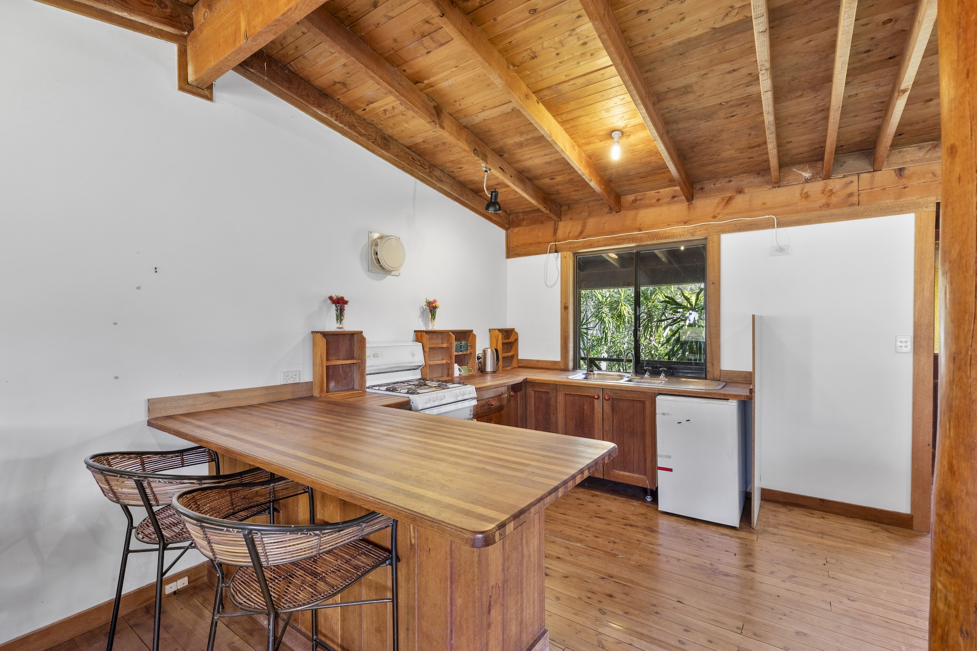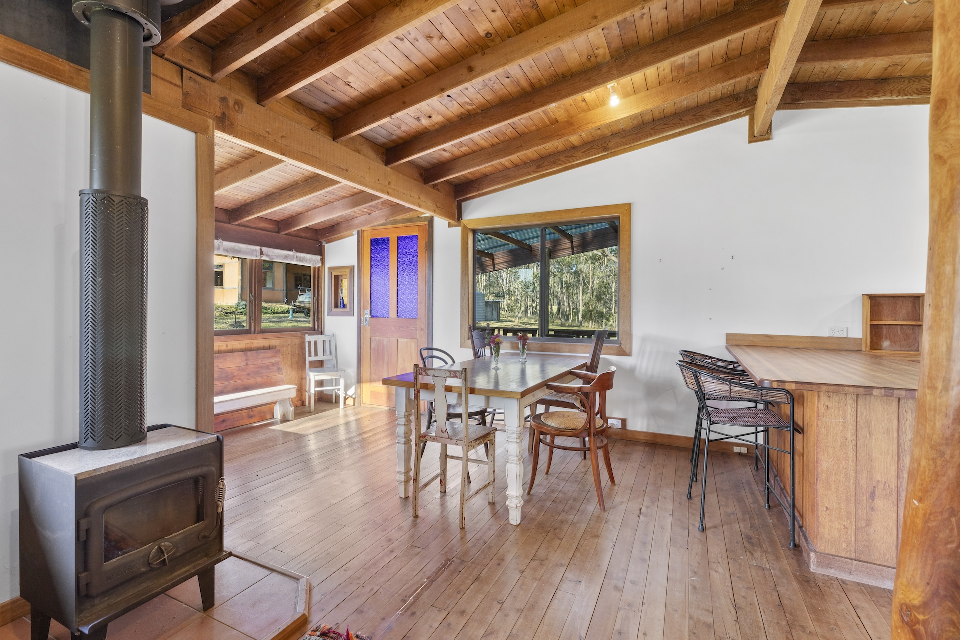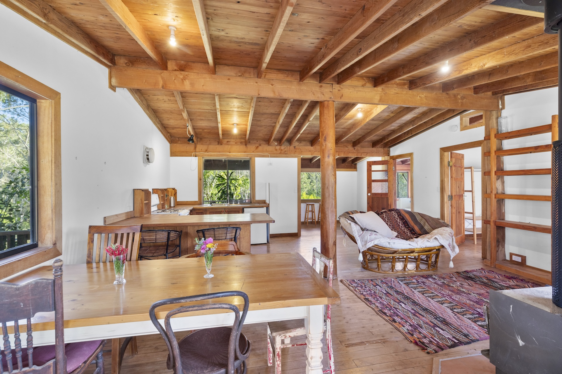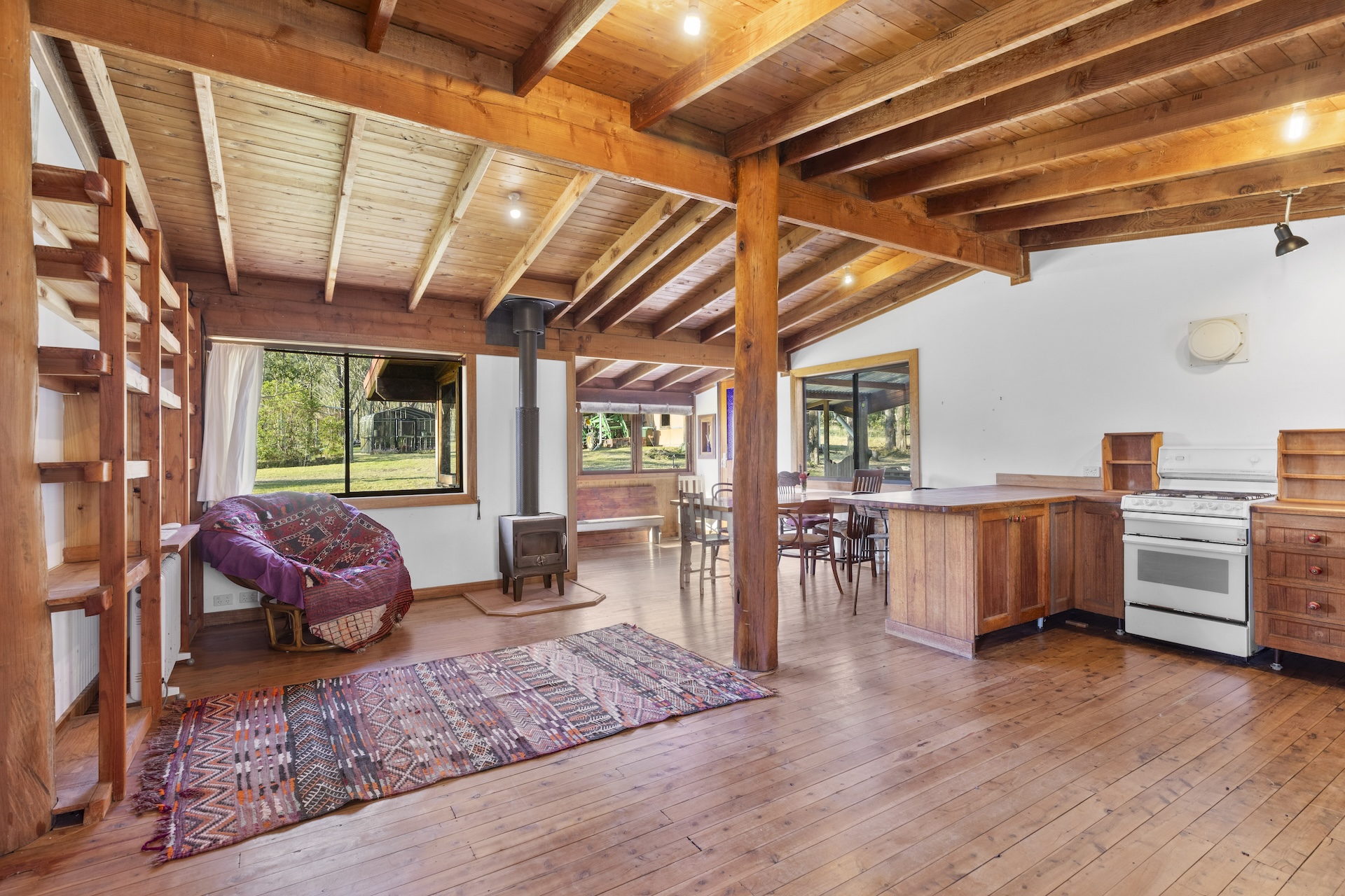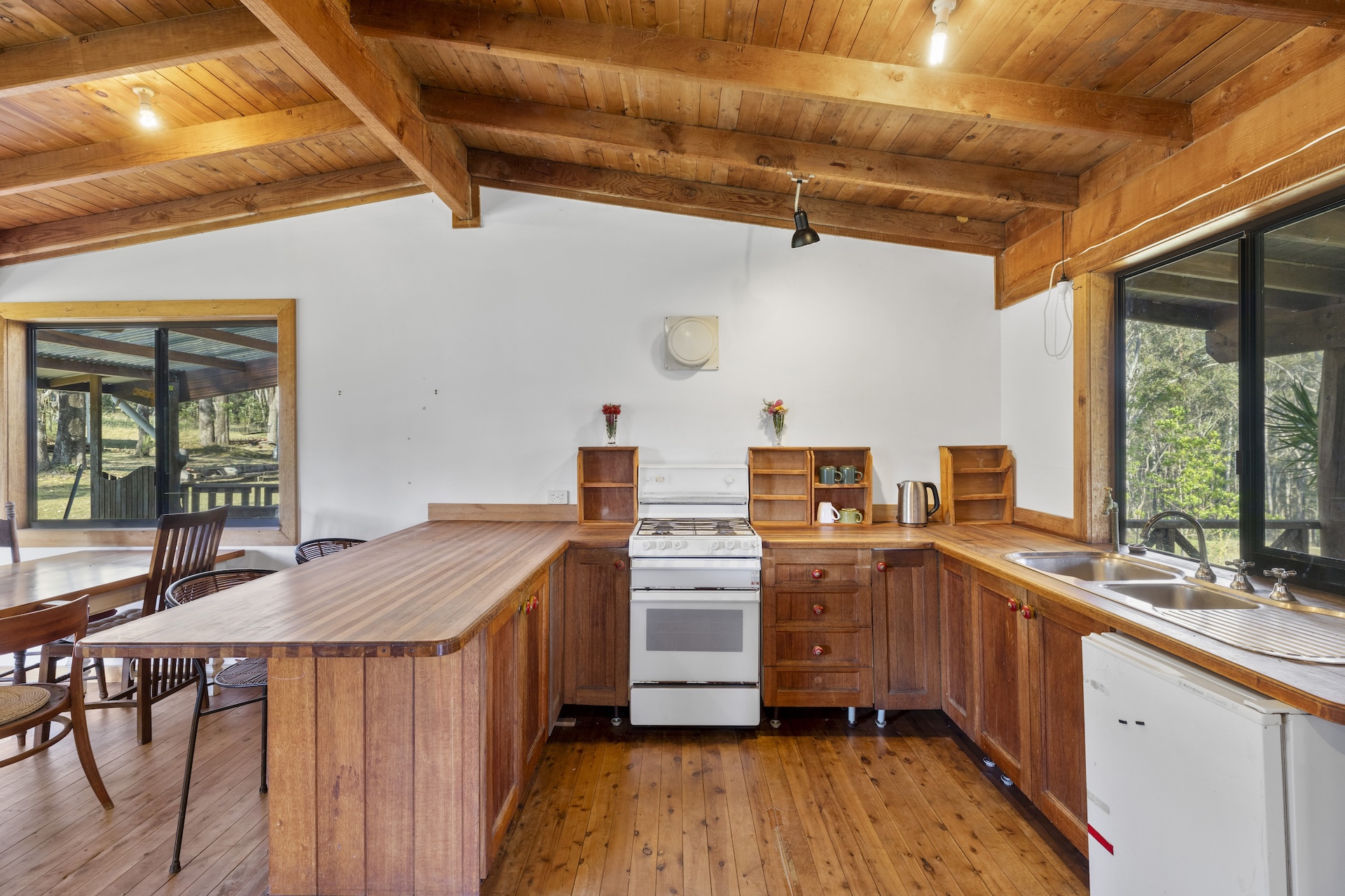 The rustic timber country kitchen is both functional and full of character, featuring solid timber benchtops with a breakfast bar, a freestanding Chef stove with a 4-burner gas cooktop and oven, and a double stainless-steel sink.