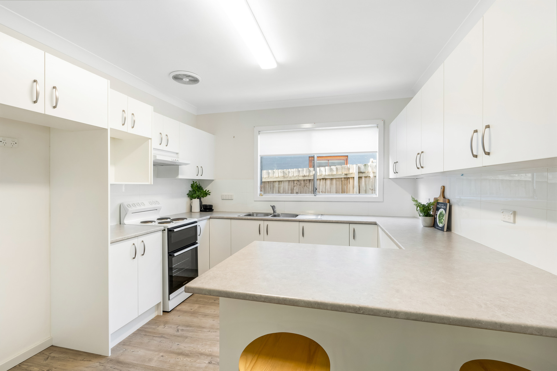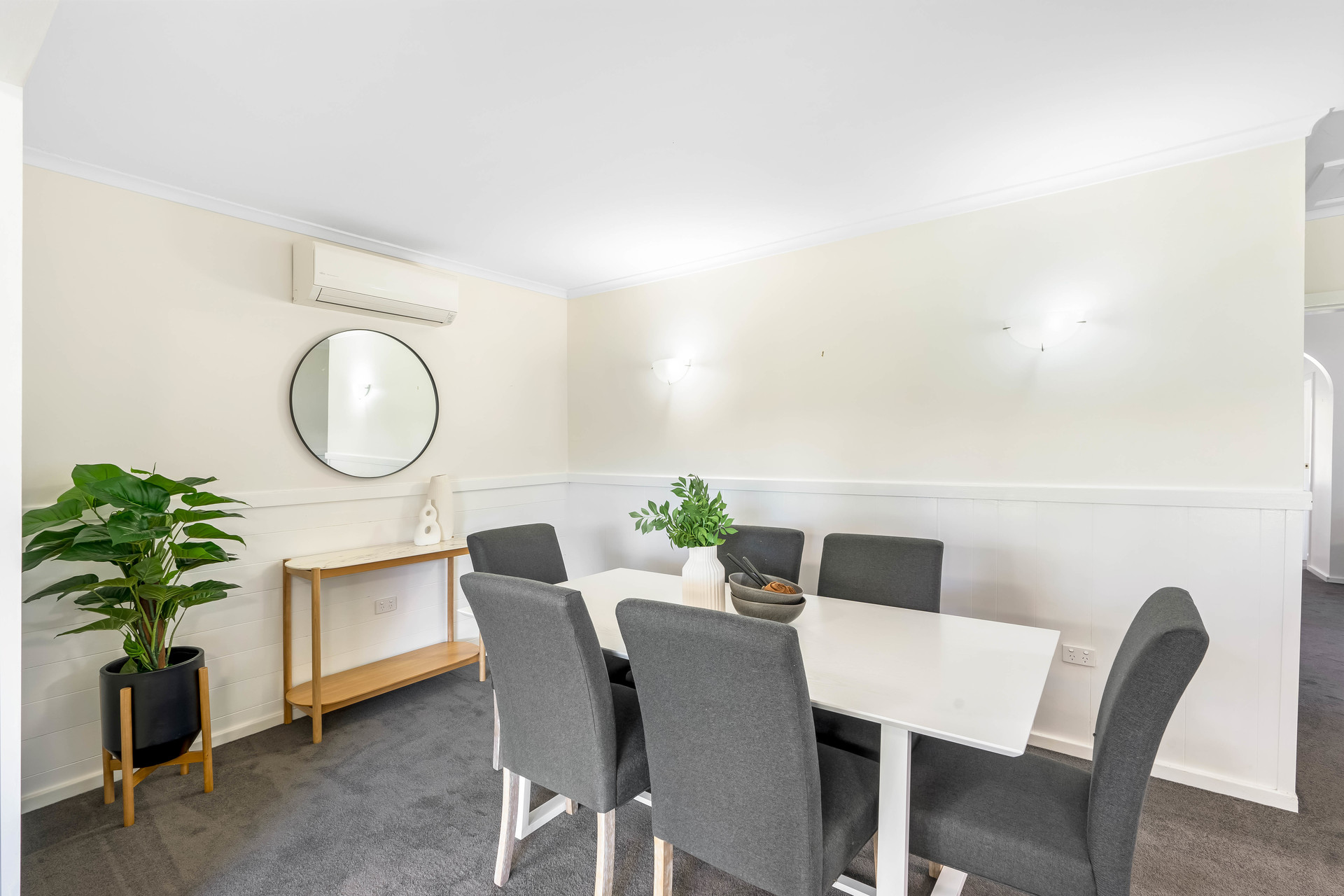 The newly renovated kitchen features extensive cabinetry, ample benchtop space for meal prep, a freestanding oven and breakfast bar seating that invites casual meals and evening chats. Flowing seamlessly from the kitchen, the open-plan dining and lounge area is a sanctuary of comfort, with plush carpeting, a split system air conditioner and picturesque windows that let the garden views in.