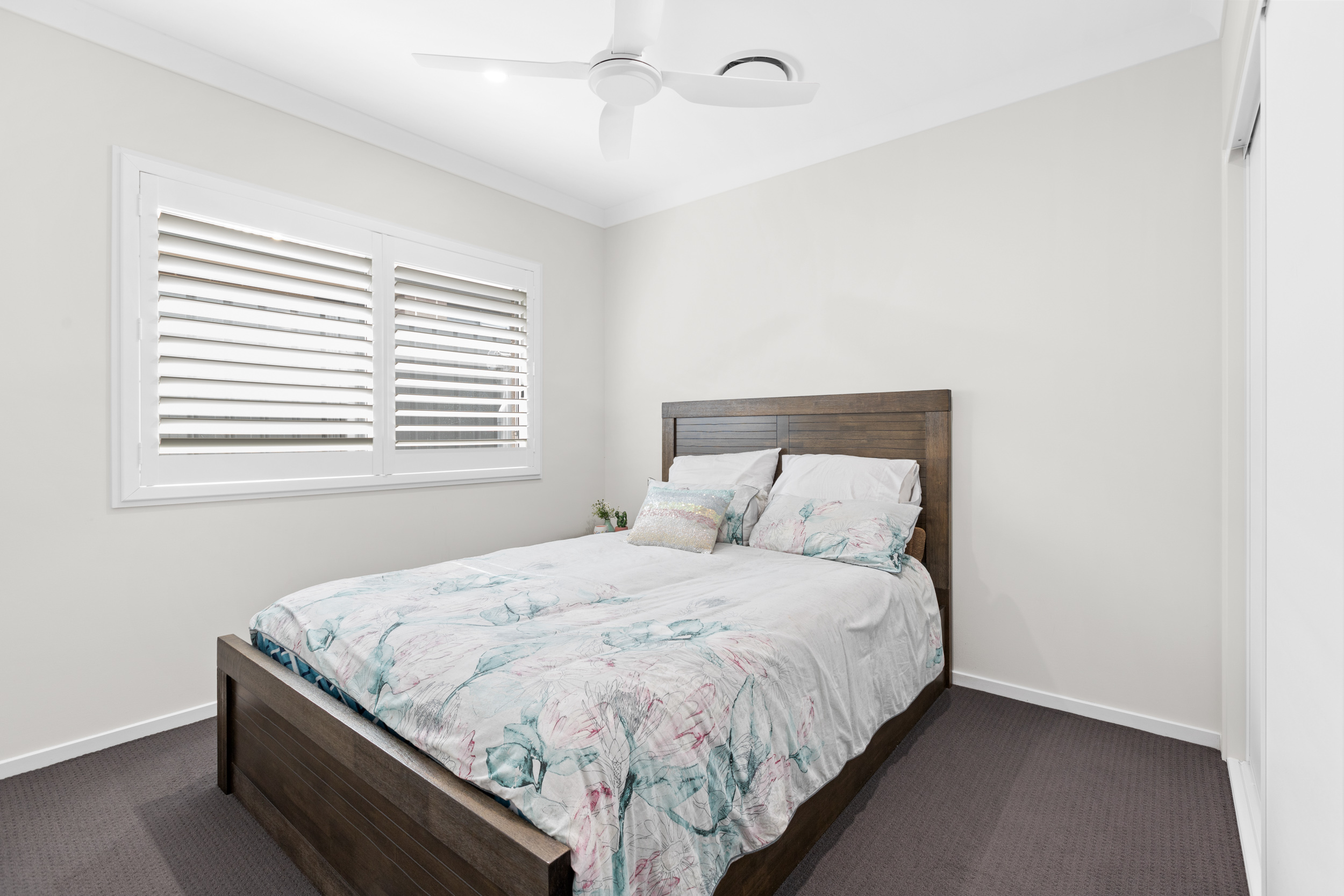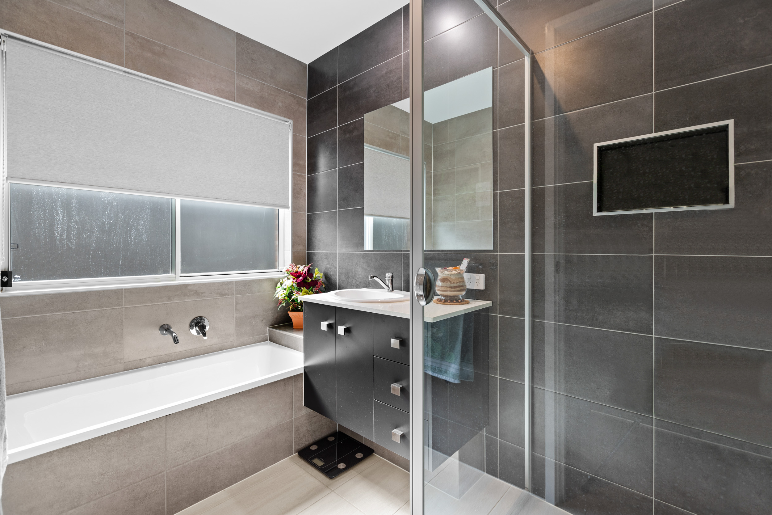 A private parents retreat boasts a vast proportions with ample space to upsize to a king sized bed whilst retaining all your additional bedroom furnishings. The spa-like main bathroom flaunts floor-to-ceiling tiling and a moody colour scheme evoking lux bathroom vibes.